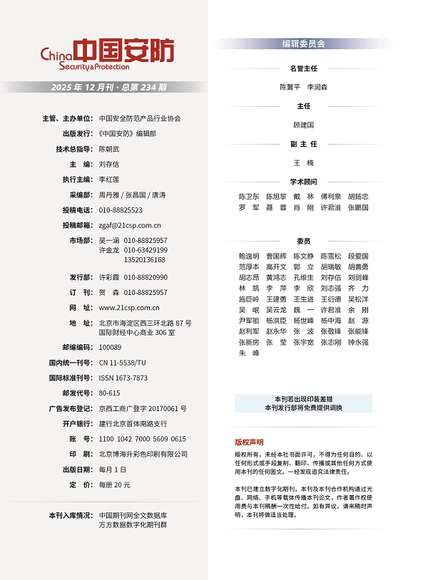 《中国安防》杂志创刊于1994年,是经国家新闻出版署批准,由中国安全防范产品行业协会主管、主办,面向国内外公开发行的国家级科技期刊,是国内安防行业宣传主要阵地及专业文章资源平台。本刊连续多年被收录于“中国核心期刊(遴选)数据库期刊”“中国期刊网全文数据库”“万方数据数字化期刊群”。