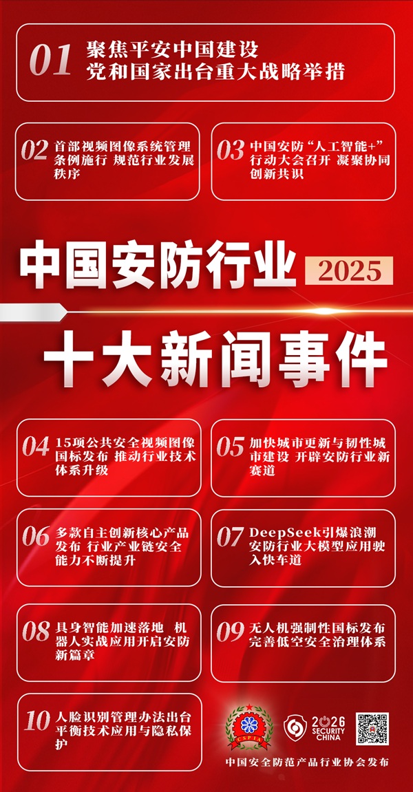 2025年是“十四五”收官与“十五五”谋篇的关键之年,我国安防行业紧扣平安建设需求,在政策赋能、技术创新与规范发展中稳步前行。经中国安全防范产品行业协会组织网络评选及专家征询,现公布反映年度发展态势的十大新闻事件。