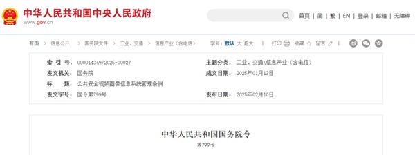 2025年2月10日,国务院发布《公共安全视频图像信息系统管理条例》,自4月1日起施行。作为我国首部专门规范该领域的行政法规,《条例》规定了视频图像系统的建设规范、使用管理、监督问责等内容,明确了隐私保护等相关要求,为公共安全视频图像系统管理提供法治遵循。