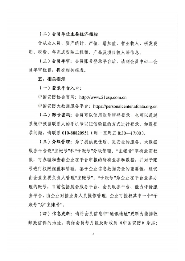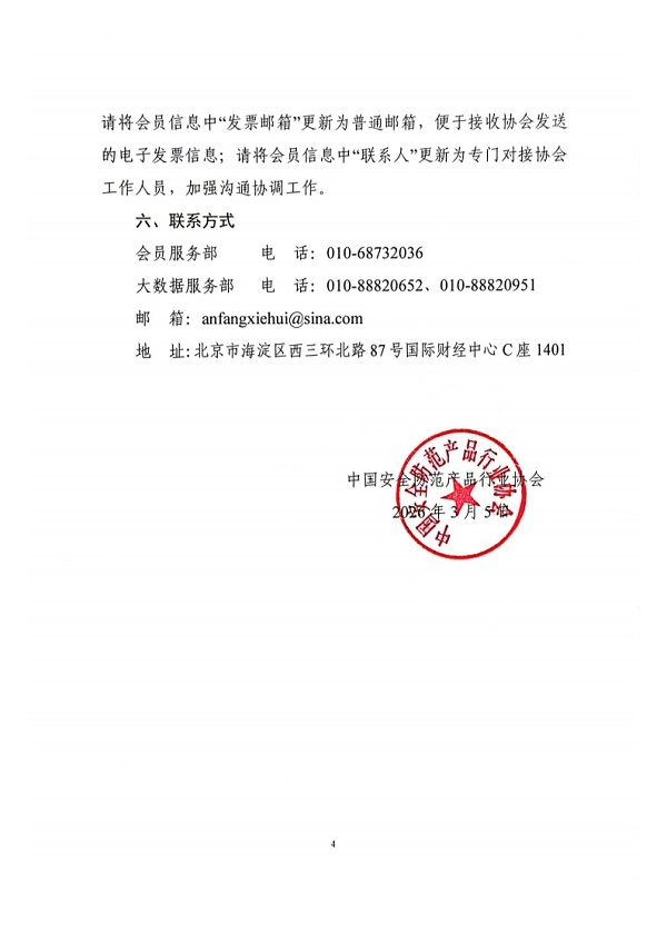 (四)信息更新:请将会员信息中"通讯地址"更新为能接收邮政信件的地址,确保会员每月能及时收到《中国安防》杂志;请将会员信息中"发票邮箱"更新为普通邮箱,便于接收协会发送的电子发票信息;请将会员信息中"联系人"更新为专门对接协会工作人员,加强沟通协调工作。