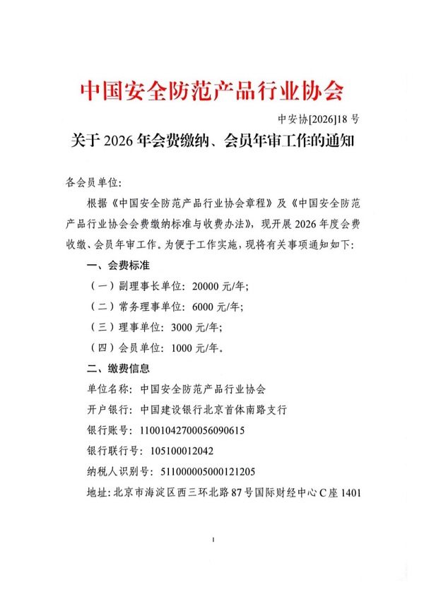 根据《中国安全防范产品行业协会章程》及《中国安全防范产品行业协会会费缴纳标准与收费办法》,现开展2026年度会费收缴、会员年审工作。为便于工作实施,现将有关事项通知如下: