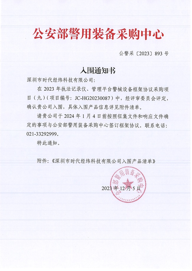 2023年12月5日,公安部警用装备采购中心(012)经过严格遴选后,公布了“公安部警用装备采购中心2023年执法记录仪、管理平台警械设备框架协议采购项目(九)中标公告”。深圳市时代经纬科技有限公司多款产品入围,此次入围是对公司技术实力和警用装备产品品质的高度认可。