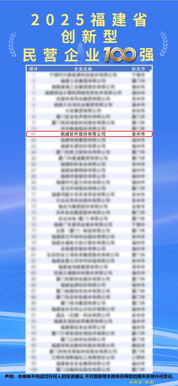 本次入选“2025福建省创新型民营企业100强”,不仅是对南威创新能力的权威认可,也将激励南威蓬勃发展、不断向前。未来,南威软件将不断加强重大、关键、核心技术创新,提高核心竞争力,充分发挥行业引领作用,以创新、智汇、数聚的力量,坚定不移地助力福建民营经济高质量发展。
