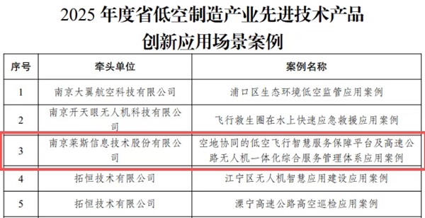 近日,江苏省工信厅发布2025年低空制造产业先进技术产品创新应用场景案例名单,莱斯信息联合江苏航空产业集团申报的“空地协同的低空飞行智慧服务保障平台及高速公路无人机一体化综合服务管理体系应用”,从激烈竞争中脱颖而出,成功入选。