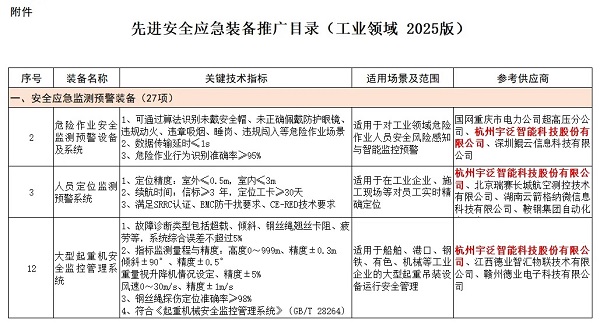 近日,工信部正式公布《先进安全应急装备推广目录(工业领域2025版)》。宇泛智能提报的三款安全应急监测预警装备——“危险作业安全监测预警设备及系统”“人员定位监测预警系统”和“大型起重机安全监控管理系统”,凭借过硬的技术实力与显著的应用成效成功入围,获得国家级荣誉。