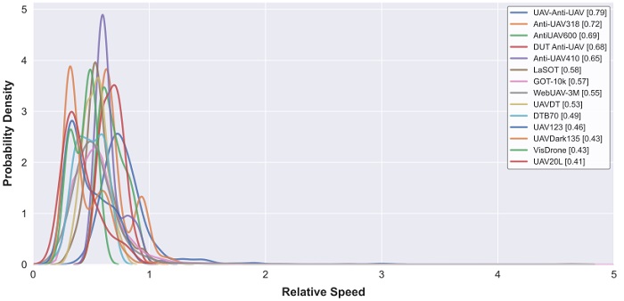 -相对速度:该数据集的平均相对速度高达0.79,远超现有的UAV123(0.46)和Anti-UAV(0.72)等数据集。