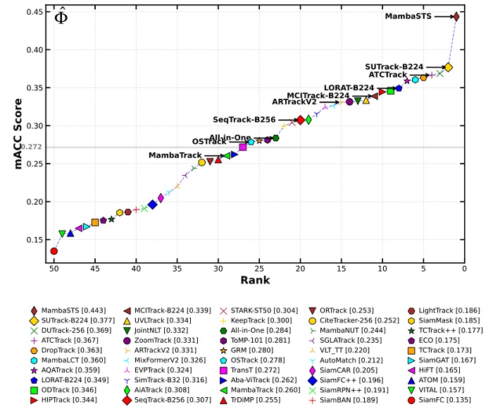 图6:50个追踪器的mACC排名散点图,MambaSTS位于右上角,大幅领先。