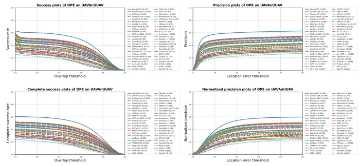 作者对50个现代深度追踪算法进行了全面评测,涵盖了CNN、Transformer、Mamba以及多模态算法(如OSTrack,MixFormer,MambaTrack,CiteTracker等)。