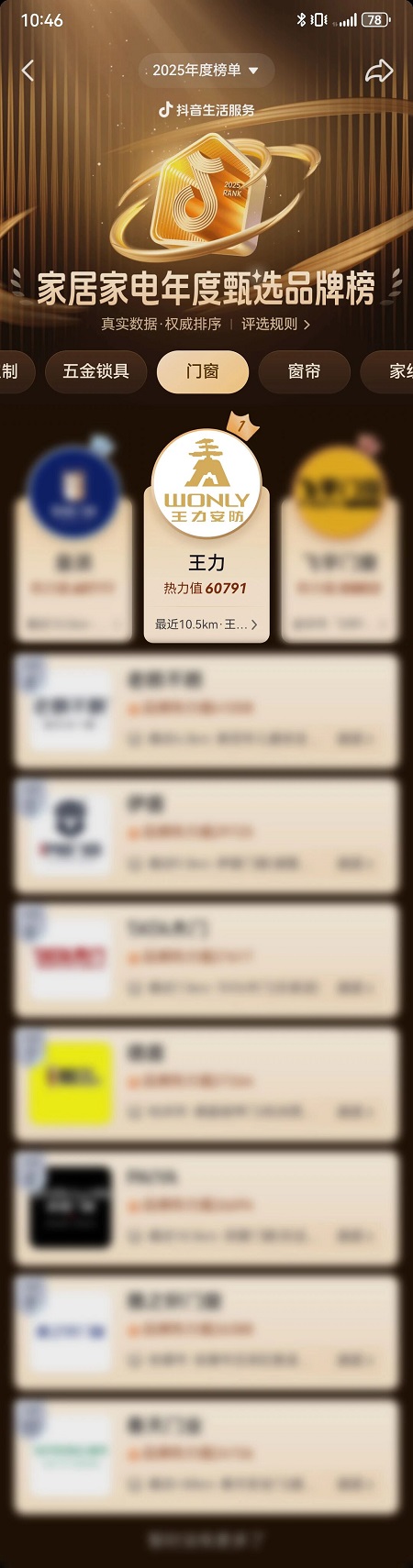 近日,抖音发布2025年度家居家电品类甄选品牌榜单,王力以综合评分第一的卓越表现,强势登顶门窗品类榜首。这不仅是对王力过去一年市场表现的肯定,更是用户用实际选择为王力投下的信任票。