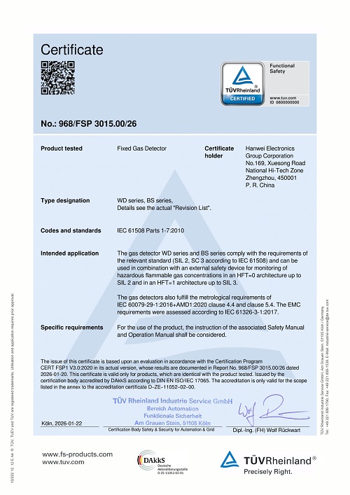德国莱茵TüV作为全球权威的第三方检测认证机构,具有国际公认的严苛标准与专业公信力,其认证标识是产品通行全球的品质通行证。此次获得TüV莱茵认证标志着汉威科技集团成为中国本土气体探测行业首家获得德国莱茵TüV功能安全认证的制造商,也是目前中国本土企业中唯一一家同时获得德国莱茵TüV功能安全(SIL2)认证与防爆认证(ATEX / IECEx)的气体探测器企业。